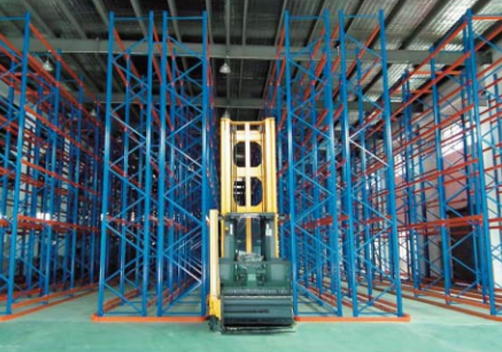 货架系统主体为横梁式货架系统,区别在于货架底部地面上加装三向堆垛叉车的行动导轨,货架系统的堆垛通道宽度稍大于托盘货物的宽度,高密度的存储需求得以实现。